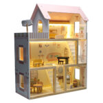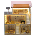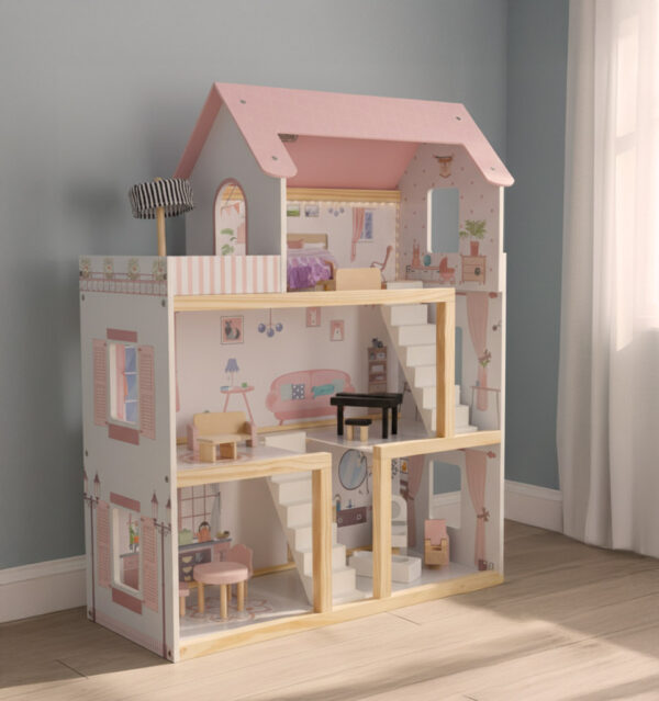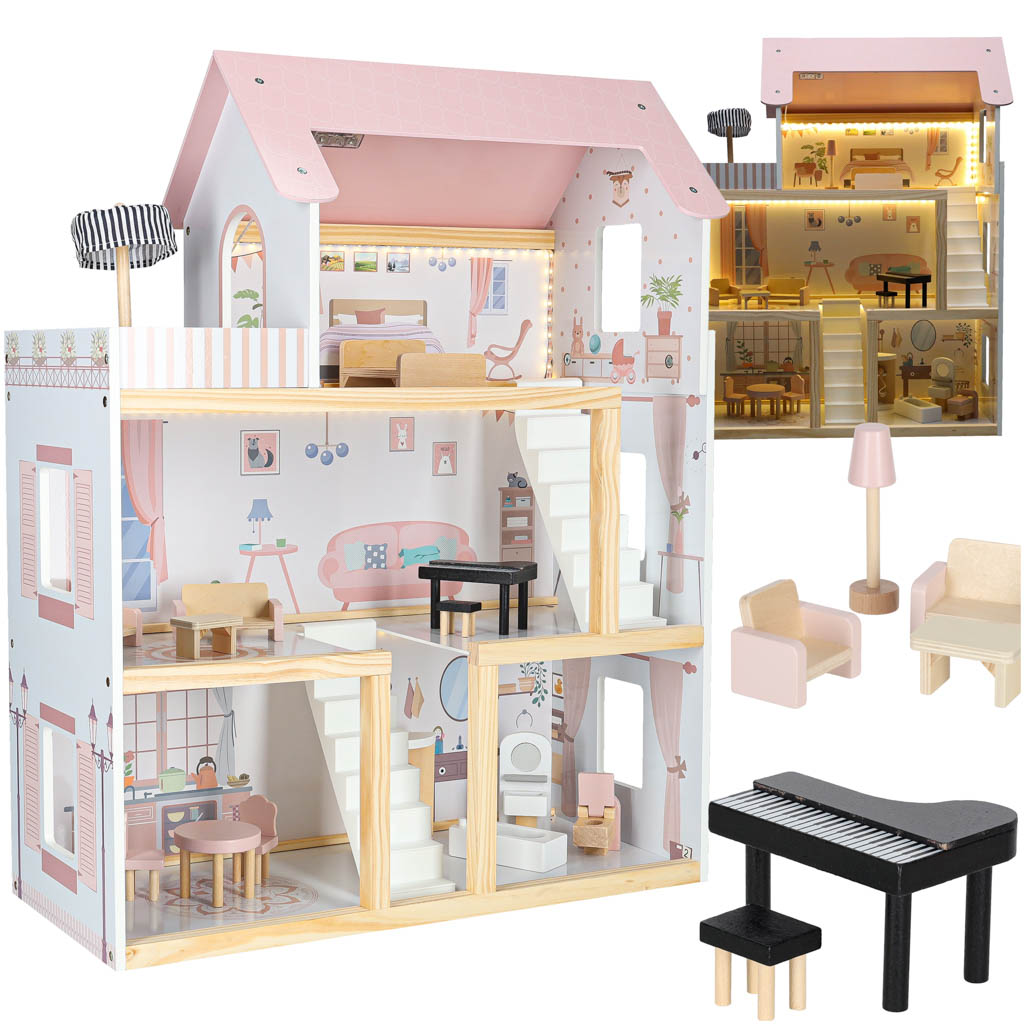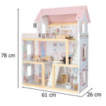 Drewniany domek dla lalek 78 cm z oświetleniem LED to wyjątkowa zabawka, która tworzy dla dziecka magiczny świat pełen wyobraźni, kreatywności i samodzielnego odkrywania. Jego pastelowy róż w połączeniu z bielą i naturalnym drewnem sprawia, że domek staje się piękną ozdobą pokoju, a miękkie światło LED nadaje wnętrzom przytulny, bajkowy klimat sprzyjający wieczornym zabawom.
