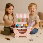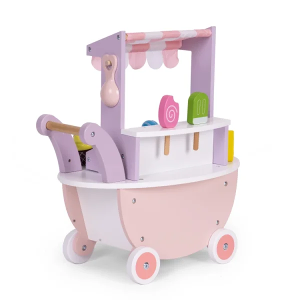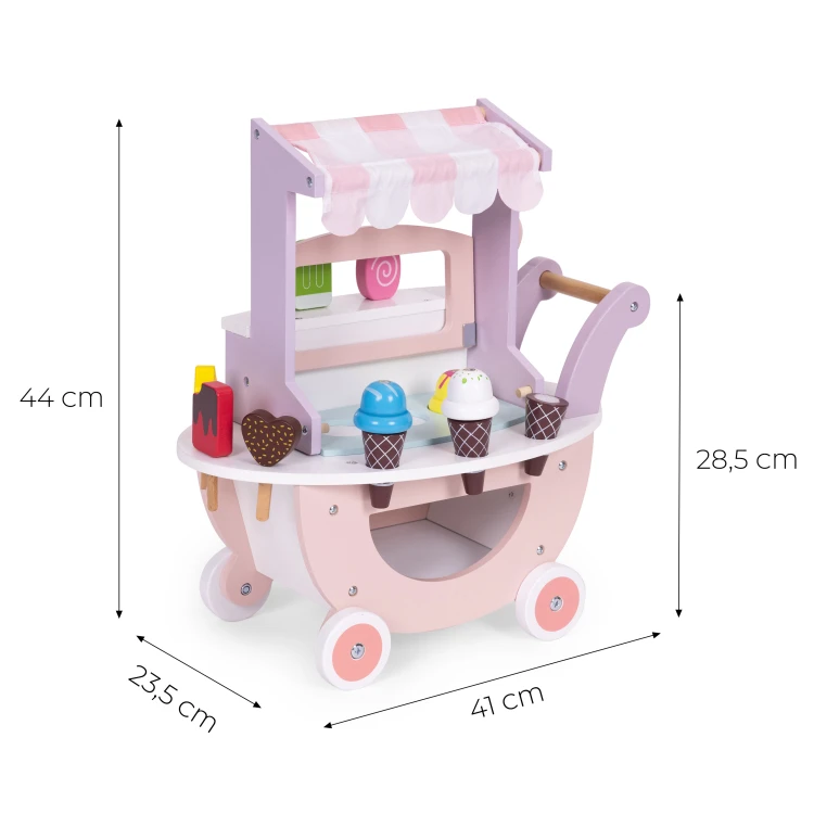Wózek–lodziarnia to idealna zabawka dla dzieci powyżej 3. roku życia, które uwielbiają zabawy w sklep i odgrywanie ról. Wykonany z trwałego drewna, zachwyca estetyką i stabilną konstrukcją pozbawioną ostrych krawędzi, dzięki czemu jest w pełni bezpieczny dla najmłodszych. Delikatna, pudrowa kolorystyka natychmiast przyciąga wzrok i zachęca do wspólnej zabawy.