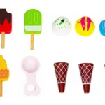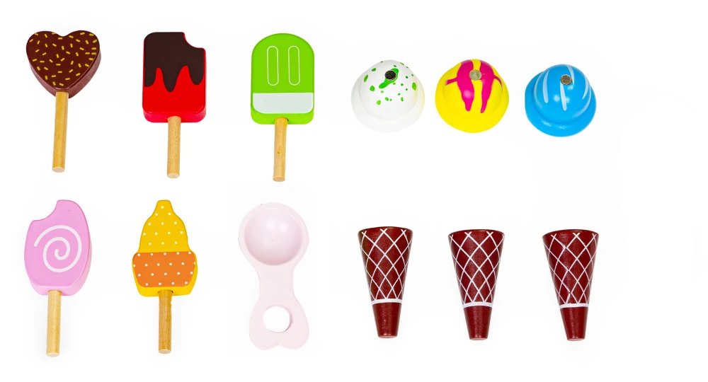 Zestaw zawiera 5 lodów na patyku, 3 wafelki, 3 kolorowe gałki lodów oraz magnetyczną łyżkę, która pozwala nakładać lody jak w prawdziwej lodziarni. Gałki łączą się na magnes, co zapewnia realistyczny efekt i jeszcze więcej frajdy podczas tworzenia lodowych kompozycji. Wózek jest lekki, wygodny w przesuwaniu i idealnie dostosowany do dziecięcych rączek.