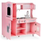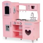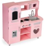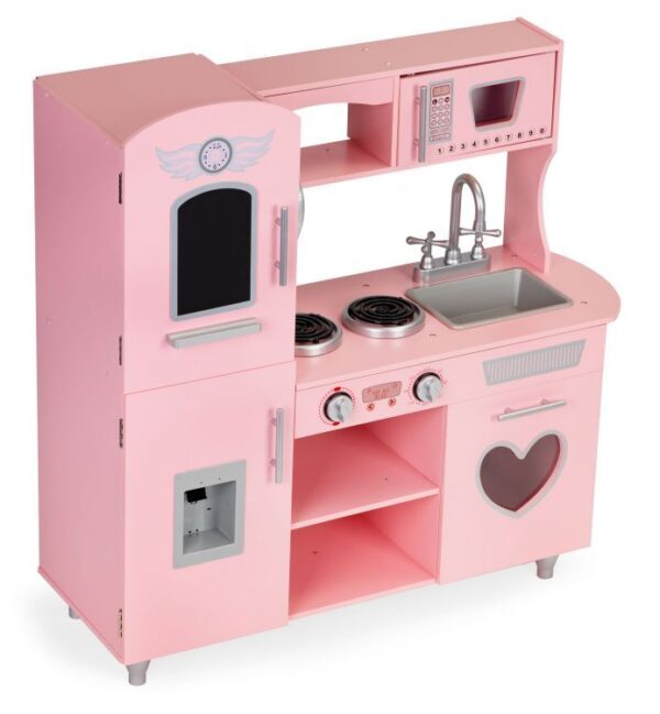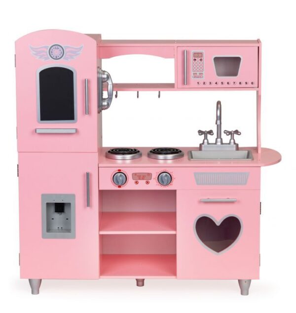 Wyposażona w otwierane drzwiczki szafek, mikrofalówki i piekarnika, dyspenser wody z efektem dźwiękowym, tablicę kredową oraz zabawkowy telefon, zachęca dziecko do kreatywnej i wielozmysłowej zabawy. Dwa palniki z klikającymi pokrętłami, zlew z kranem i obrotowe kurki sprawiają, że maluch może poczuć się jak w prawdziwej kuchni.
