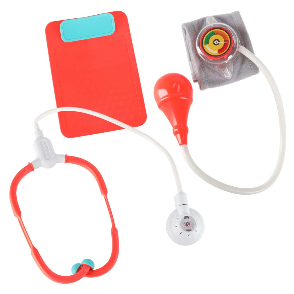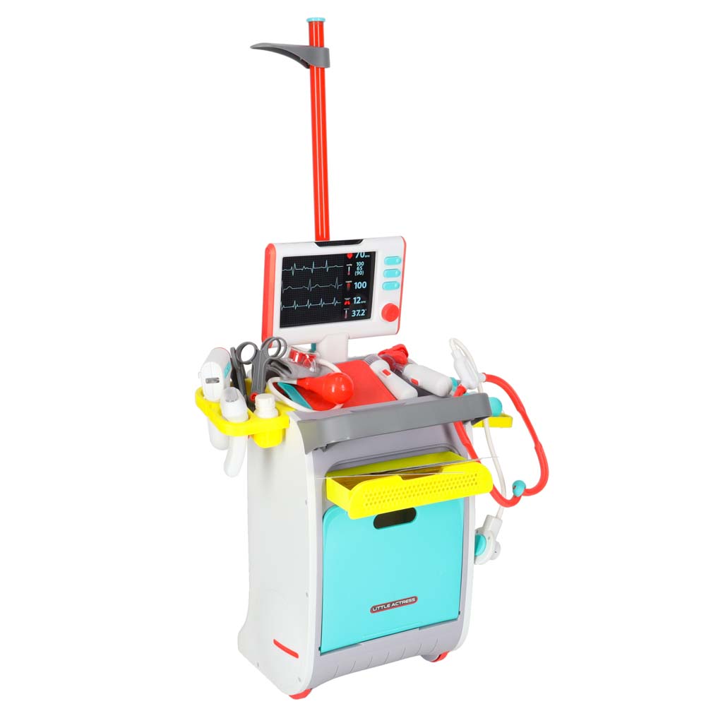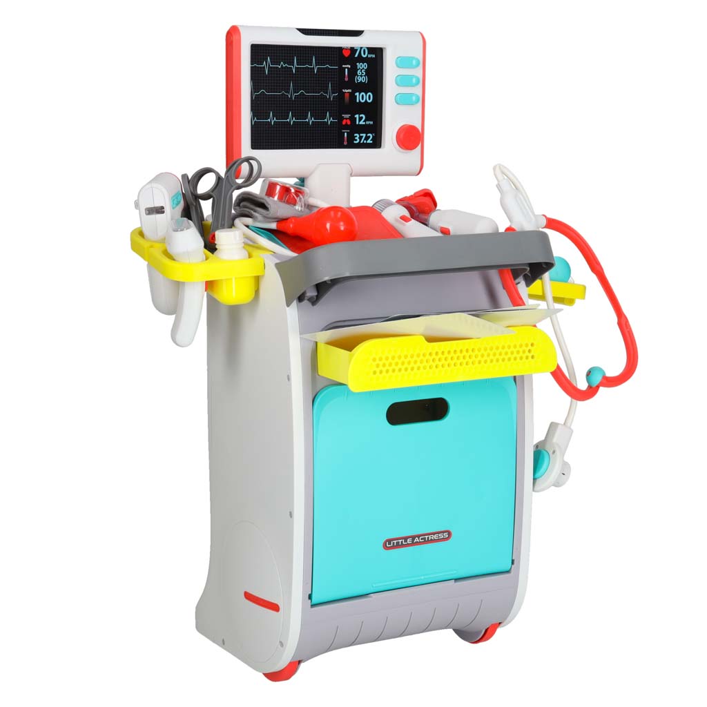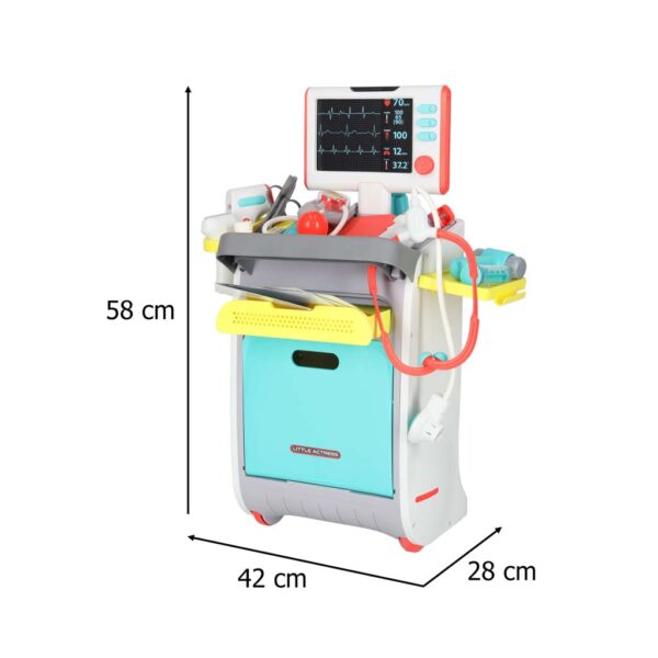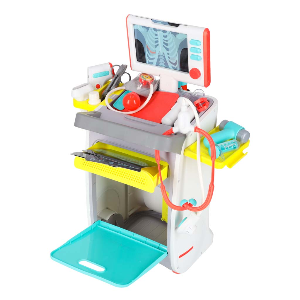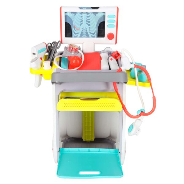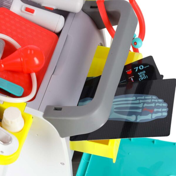 Bogaty zestaw lekarski zawiera stetoskop, termometr, strzykawkę, lusterko dentystyczne, ultrasonograf, a także panel RTG i EKG, które sprawiają, że badanie misiów i lalek staje się wyjątkowo realistyczne. Wózek ma funkcjonalne szufladki, ramkę-ekran na zdjęcia rentgenowskie oraz rozkładaną miarkę, dzięki której maluch może także mierzyć wzrost swoich pacjentów.
