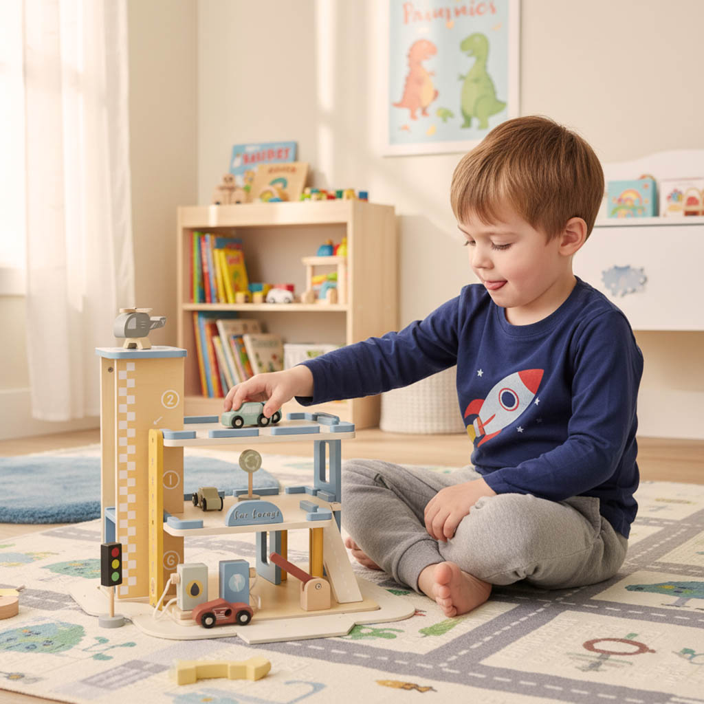 Drewniany trzypiętrowy parking ze stacją benzynową pozwala dziecku tworzyć własne motoryzacyjne historie, rozwijając wyobraźnię, koordynację i zabawę w odgrywanie ról. Ruchoma winda oraz strefa tankowania dodają realizmu i zachęcają do kreatywnej zabawy na kilku poziomach. Solidna, ekologiczna konstrukcja sprawia, że to trwały i estetyczny zestaw idealny dla małych fanów aut.