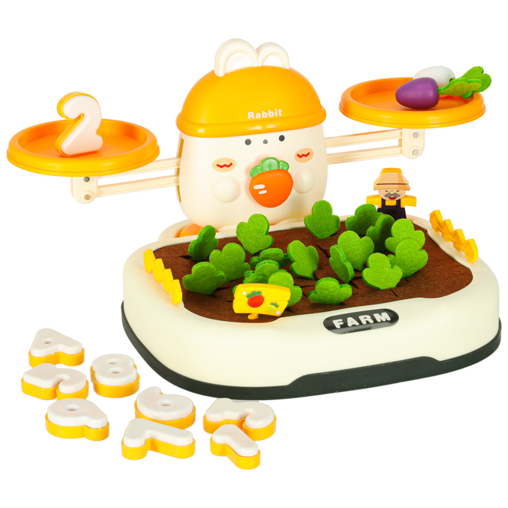 Dziecko wciela się w rolę małego ogrodnika – sadzi, zbiera i waży warzywa, poznając kolory, kształty i liczby. Huśtawka z królikiem zachęca do eksperymentowania z równowagą, a cyferki o zróżnicowanej wadze pomagają zrozumieć pojęcie wartości liczbowej w praktyce. Zabawka rozwija koordynację ręka–oko, motorykę małą, koncentrację i refleks, oferując różne tryby gry, które nigdy się nie nudzą.
