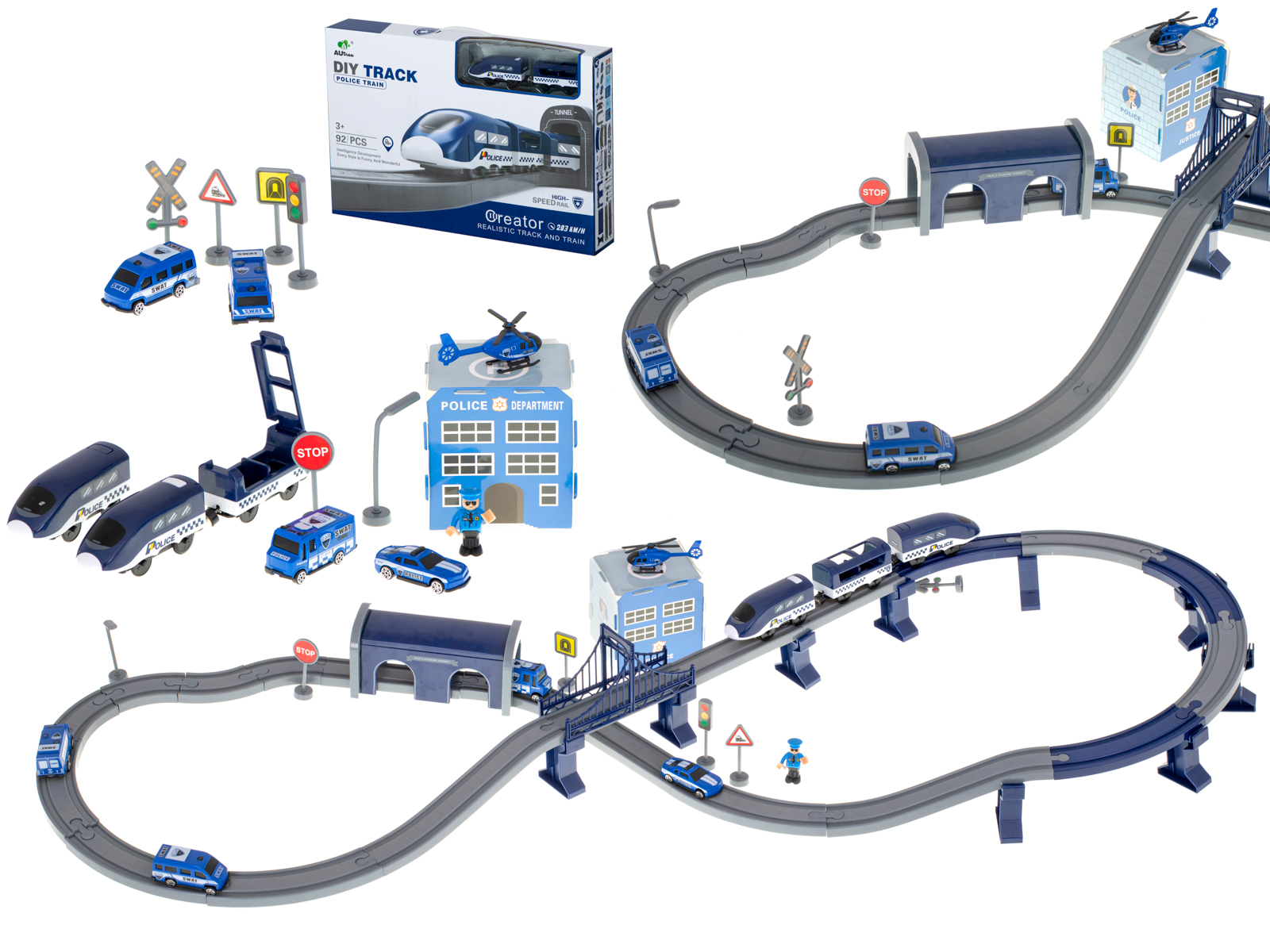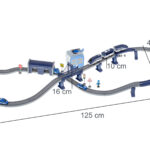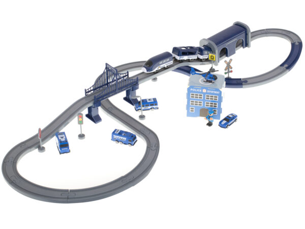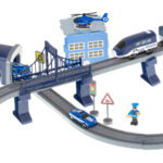 Kolejka elektryczna Pociąg Policja – 92 elementy to zestaw, który łączy w sobie mnóstwo dziecięcych pasji: samochody, helikoptery, pociągi, tory i pełne akcji pościgi policyjne. To zabawka, która rozwija wyobraźnię, kreatywność, małą motorykę i zdolności konstrukcyjne, już od momentu składania torowiska. Dzięki aż 6 różnym układom torów, mostom, tunelom i dwupoziomowym konstrukcjom dziecko może tworzyć dynamiczne, pełne przygód scenariusze zabawy.