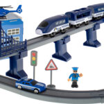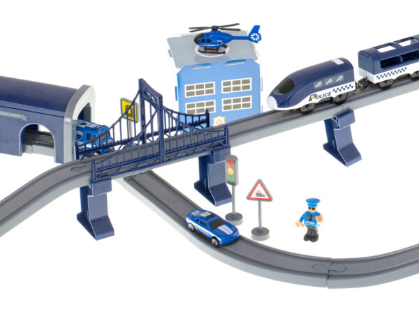 W zestawie znajduje się trzyczęściowy pociąg z lokomotywą na baterie, realistyczne wagony, 4 auta policyjne, helikopter oraz pełne detali elementy otoczenia, takie jak komisariat, znaki drogowe czy tunel. Magnesowe łączenia ułatwiają tworzenie składów, a ruchomy dźwig i otwierane elementy dodają zabawie realizmu. To idealny zestaw do odgrywania ról, trenowania logicznego myślenia i rozwijania wiedzy o pracy policjantów oraz zasadach bezpieczeństwa.