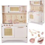 Kuchnia wyposażona jest w liczne akcesoria drewniane, kran z pokrętłami, głęboki zlew oraz palniki z efektami świetlnymi i dźwiękowymi, które sprawiają, że zabawa staje się wyjątkowo realistyczna. Dziecko może korzystać z piekarnika z ratanową siatką, relingu z haczykami, garnka, patelni, przyprawników i kompletu kuchennych łyżek. Taka ilość elementów sprawia, że maluchy mogą wcielać się w rolę małych kucharzy, odtwarzać scenki z życia codziennego i tworzyć własne kulinarne historie.