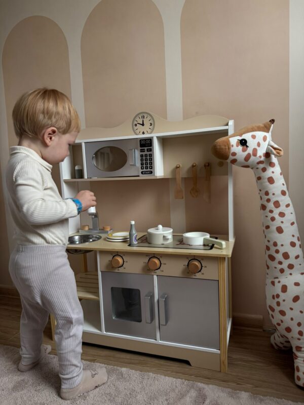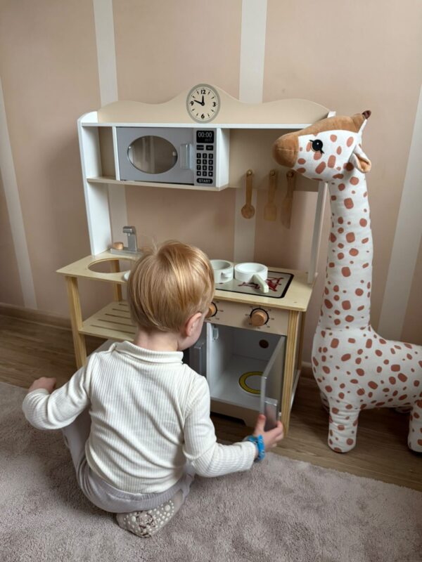 Drewniana kuchnia wspiera rozwój dziecka na wielu poziomach — doskonale ćwiczy motorykę małą, precyzję ruchów oraz koordynację ręka–oko. Krojenie, mieszanie, przesypywanie czy „gotowanie” pozwalają wzmacniać paluszki i rozwijać sprawność manualną. To także świetny sposób na rozwijanie umiejętności poznawczych, logicznego myślenia i organizacji działania podczas zabawy w kuchenne obowiązki.