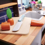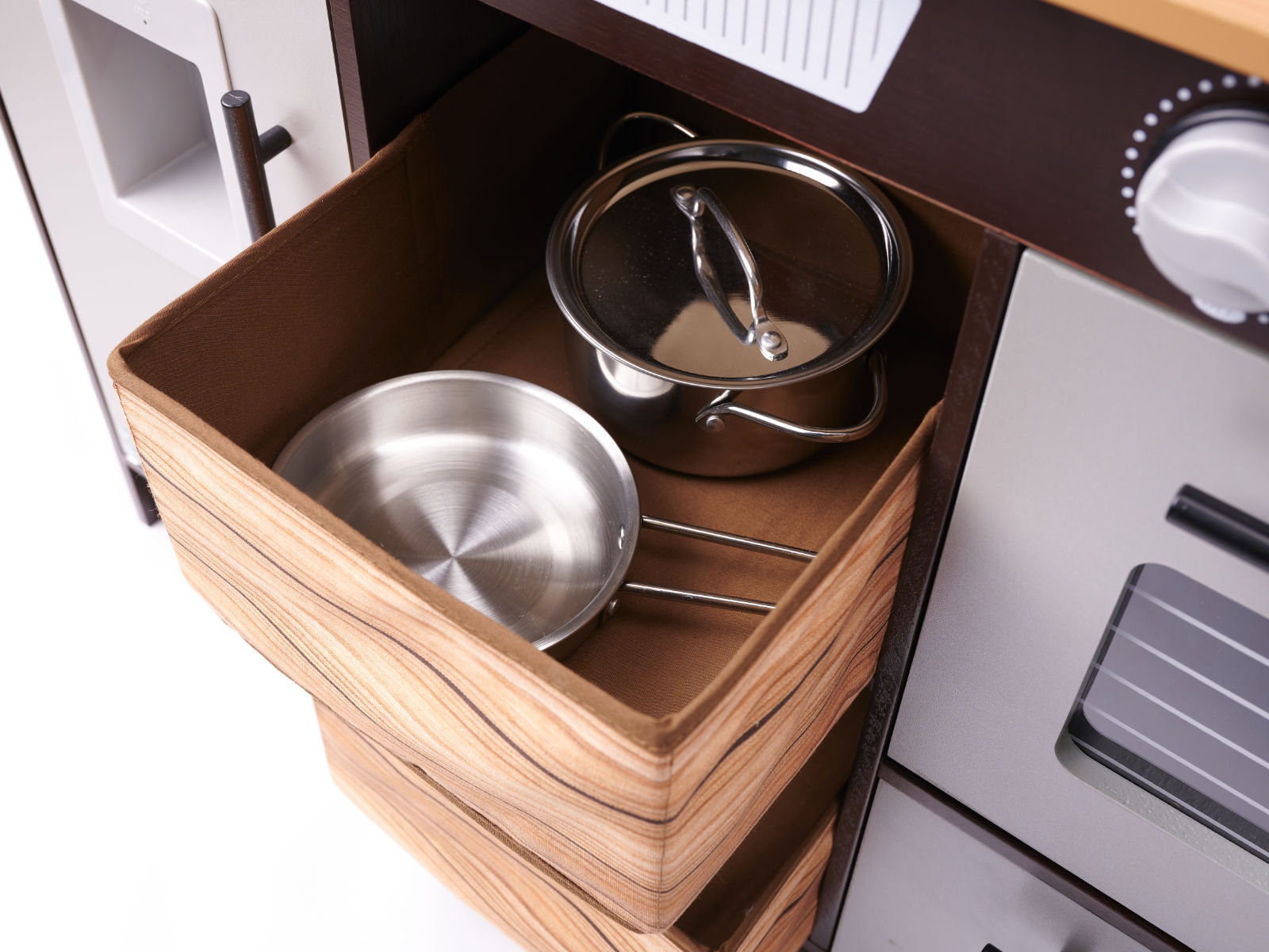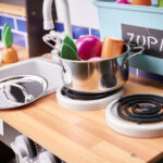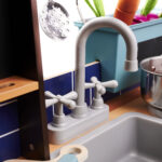 Kuchnia została wyposażona w bogaty zestaw realistycznych akcesoriów – metalową patelnię, garnek z pokrywką, drewniany nóż, świeże „warzywa” do krojenia oraz praktyczne dodatki, takie jak piekarnik z otwieranymi drzwiczkami, materiałowe organizery, szafki i głęboki zlew z kranem. Największą atrakcją jest lodówka z imitacją kostkarki do lodu, która wydaje realistyczne dźwięki, oraz palniki z efektami świetlnymi i dźwiękowymi, dodające zabawie niezwykłego realizmu. Każde dziecko poczuje się jak w prawdziwej kuchni!