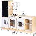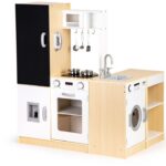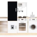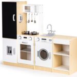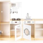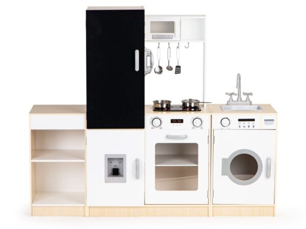 Kuchnia składa się z 4 dużych segmentów: pralki, lodówki z tablicą kredową, kuchenki oraz szafki z półkami. Realizmu dodają podświetlane palniki, dźwięk gotującej wody, piekarnik, mikrofalówka i duży funkcjonalny zlew. Wszystkie elementy są otwierane, co znacznie poszerza możliwości zabawy.