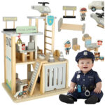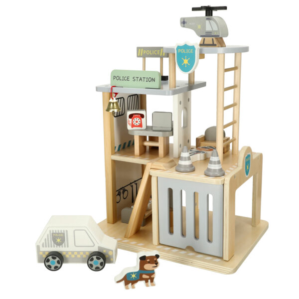 Drewniany komisariat policji to wyjątkowa zabawka dla dzieci, które uwielbiają mundury, akcje ratunkowe i pilnowanie porządku. Trzypoziomowa konstrukcja z garażem, biurem i lądowiskiem dla helikoptera pozwala dzieciom przenieść się w świat misji i interwencji. Całość została wykonana z gładko oszlifowanego drewna i pomalowana nietoksycznymi farbami, dzięki czemu zabawka jest bezpieczna, trwała i estetyczna.