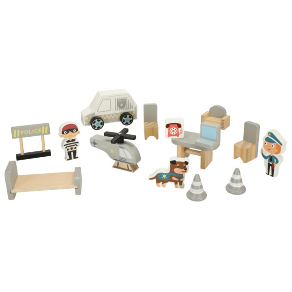 W zestawie znajduje się wszystko, co potrzebne do tworzenia dynamicznych scen akcji: figurka policjanta, złodzieja, policyjny pies, a także radiowóz i helikopter. Różnorodność elementów pozwala dziecku odgrywać realistyczne historie – od pościgów, przez interwencje, po patrolowanie miasta. To zabawka, która zachęca do kreatywnego myślenia i tworzenia własnych, pełnych emocji scenariuszy.