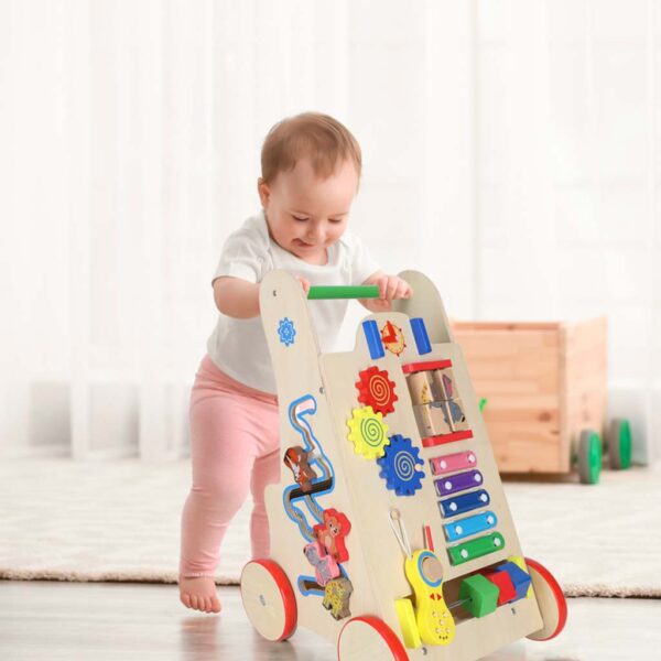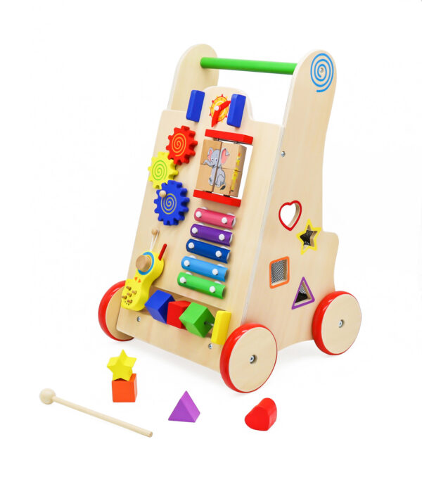 Przedni panel pełen jest kolorowych aktywności: koła zębate, obrotowa układanka, ruchome kostki, cymbałki, zegar i telefon – wszystko, co przyciąga uwagę dziecka i rozwija zdolności manualne. Na bokach znalazły się sorter kształtów oraz labirynt z koralikami, które uczą logicznego myślenia i cierpliwości. Każdy element został starannie dopracowany, by zapewnić bezpieczeństwo i komfort zabawy.