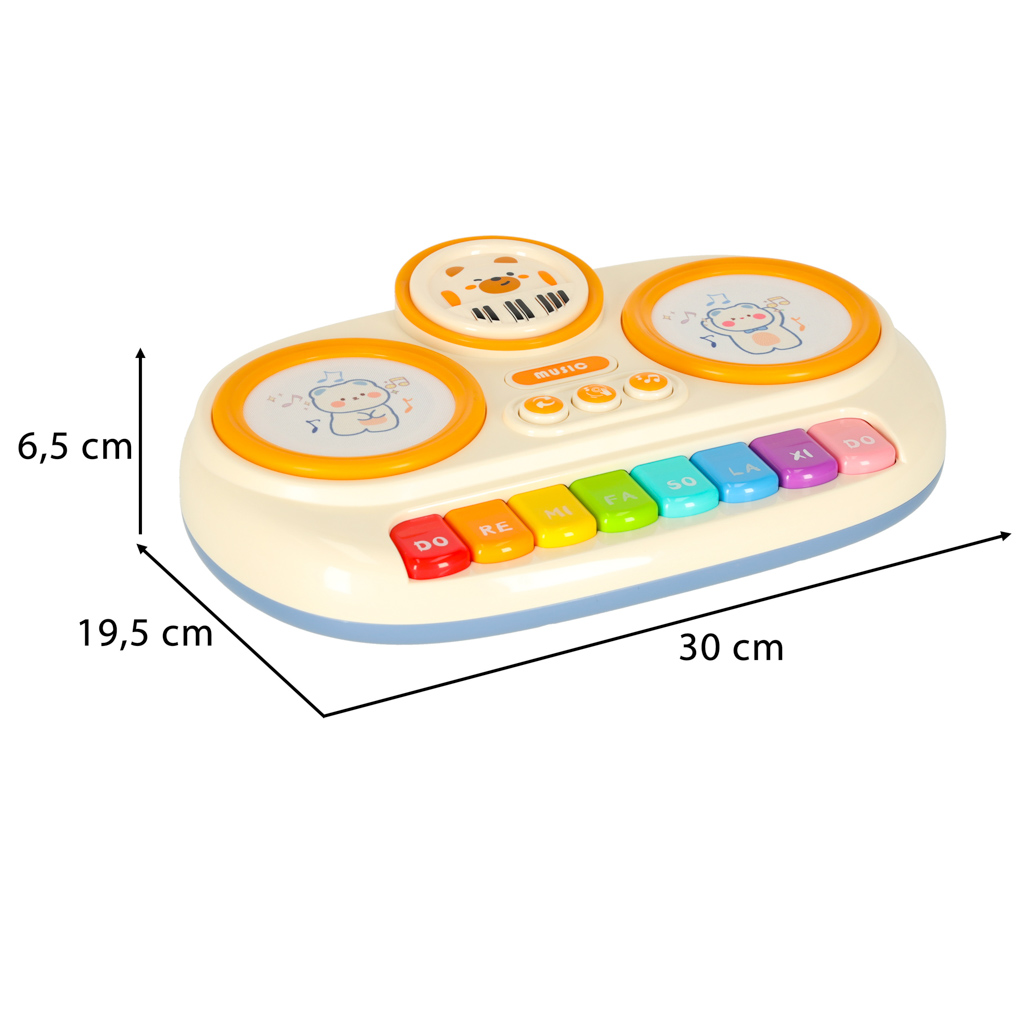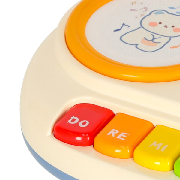 Pianinko oferuje różne tryby zabawy – od grania prostych melodii i poznawania instrumentów, po efekty świetlne towarzyszące każdemu naciśnięciu klawisza. Dodatkowe miękkie pady-bębenki wprowadzają rytmiczny element, ucząc dziecko poczucia tempa i koordynacji. Duże, kolorowe klawisze pomagają ćwiczyć motorykę małą, pamięć dźwiękową i wyobraźnię muzyczną, rozwijając przy tym słuch i koncentrację.