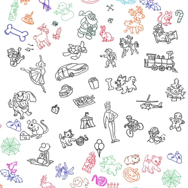 • 6x arkuszy z obrazkami po 12 obrazków – 72 motywy do odrysowania