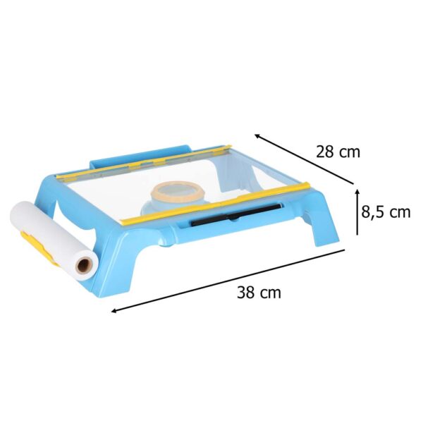 Zestaw zawiera wygodny, stabilny stolik do rysowania, który tworzy dziecku idealne miejsce do twórczej pracy — w domu, pokoju czy w podróży. Wystarczy włożyć slajd do projektora, ustawić ostrość i położyć kartkę, by rozpoczynała się prawdziwa magiczna przygoda z rysowaniem. Dołączona rolka papieru A4 oraz 12 kolorowych mazaków i kredek zapewniają nieograniczone możliwości zabawy, a jasne, delikatne światło projektora doskonale podświetla każdy wzór.