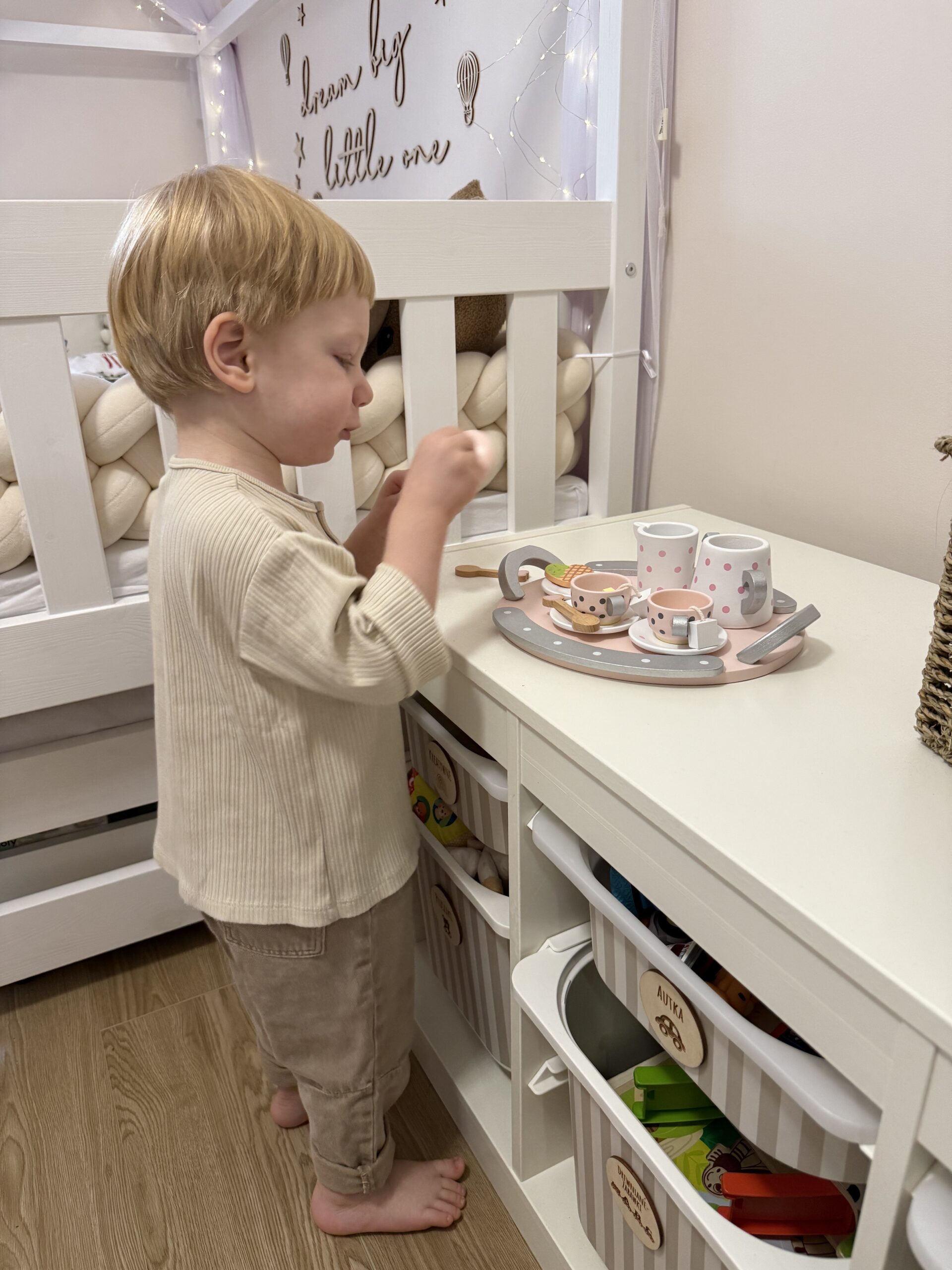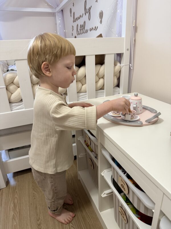 Różowo-szara kolorystyka i starannie wykonane akcesoria sprawiają, że zabawa staje się wyjątkowo przyjemna i twórcza. W zestawie znajdują się m.in. dzbanek z pokrywką, filiżanki, łyżeczki, talerzyki, taca, herbatka i ciastka – wszystko, czego potrzeba, by zorganizować idealne przyjęcie. Zestaw rozwija umiejętności społeczne, uczy savoir-vivre oraz zachęca do kreatywnego odgrywania ról.
