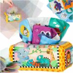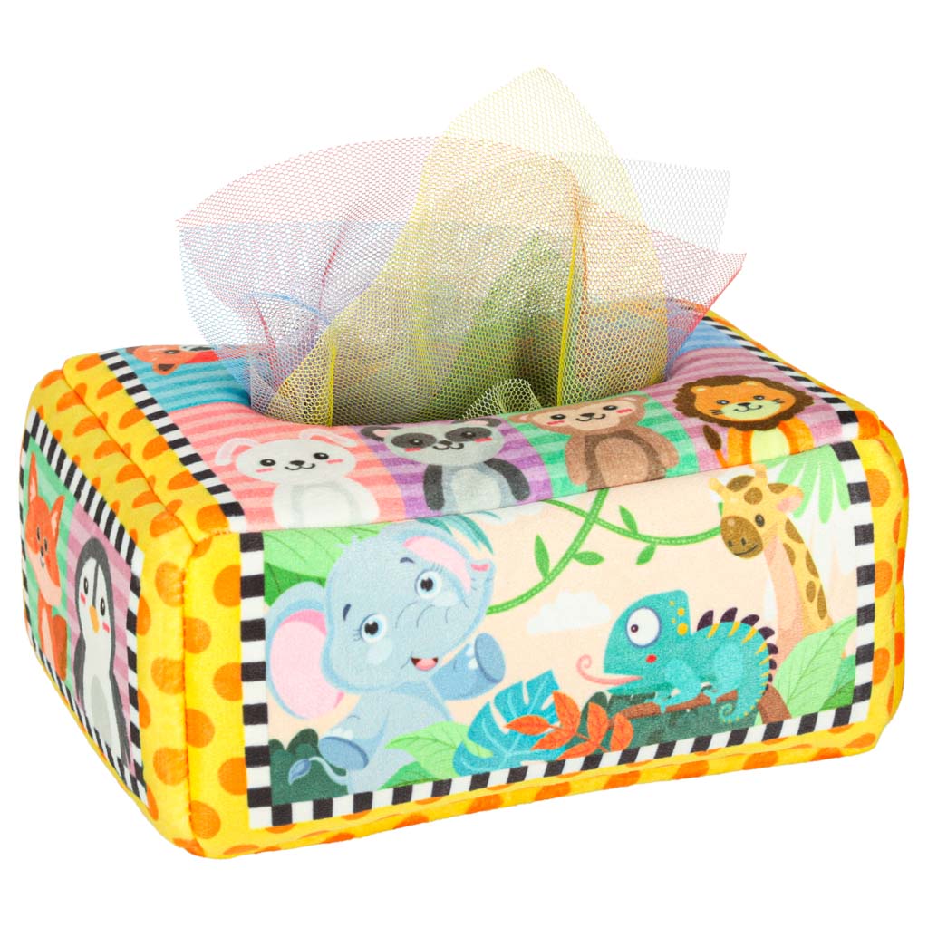 W zestawie znajduje się miękkie pudełko oraz 11 różnorodnych chusteczek – gładkich, wzorzystych, a trzy z nich delikatnie szeleszczą, pobudzając zmysł słuchu i dotyku. Wyciąganie i wkładanie chustek to fantastyczne ćwiczenie motoryki małej i logicznego myślenia, które uczy cierpliwości i koordynacji. Wszystkie elementy wykonano z nietoksycznych, przyjaznych dla skóry materiałów, które można łatwo prać, co czyni zabawkę praktyczną i trwałą.
