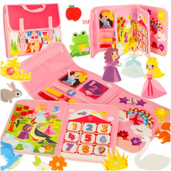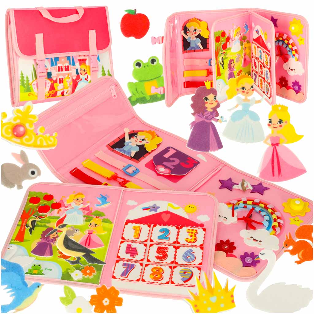 Na sześciu stronach aktywności czeka ponad 30 różnorodnych zadań, które rozwijają sprawność rączek, koordynację i samodzielność – od zapinania guzików i zamków, przez naukę wiązania, aż po tworzenie stylizacji z filcowych ubrań. Zabawka uczy również liczenia, alfabetu i angielskich słówek poprzez kolorowe wyklejanki. Całość zamknięta jest w miękkiej, bezpiecznej formie, idealnej do zabrania w podróż, do przedszkola czy na wizytę u dziadków.