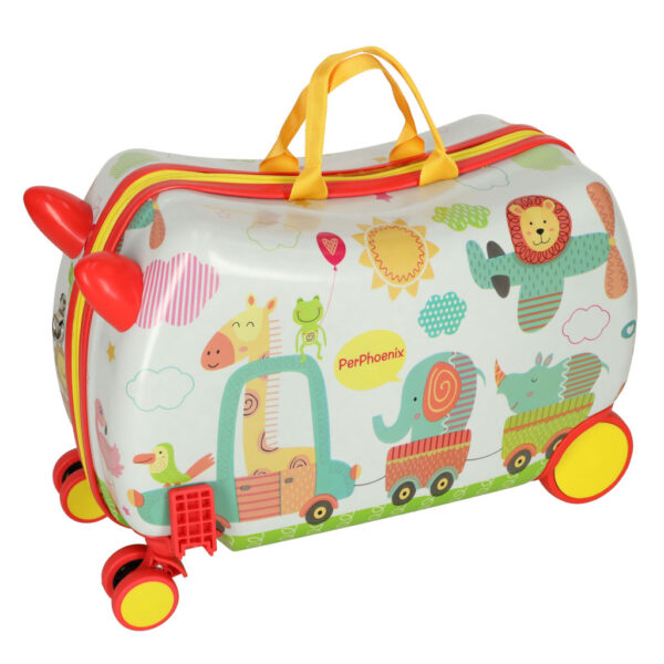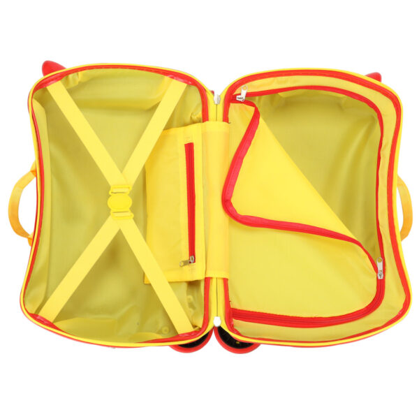 Kolorowa grafika i solidna konstrukcja przyciągają uwagę i zachęcają do samodzielnego pakowania. Walizka wyposażona jest w cztery obrotowe kółka oraz stabilną rączkę, co ułatwia jej prowadzenie nawet najmłodszym użytkownikom. Dodatkowo posiada specjalne podpórki na nóżki, dzięki czemu dziecko może na niej wygodnie usiąść i odpocząć w trakcie podróży. Wnętrze z dwiema dużymi przegrodami i kieszonką na zamek umożliwia utrzymanie porządku i łatwy dostęp do potrzebnych rzeczy.